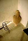 Clay amphorae held most of the wine and olive oil until glass bottles and corks replaced them. This old urn is still being used to hold refreshment for the workers raking grapes from trucks to old fashioned crushers in Spain. Click here for the rest of the pictory and enlargements of the print.