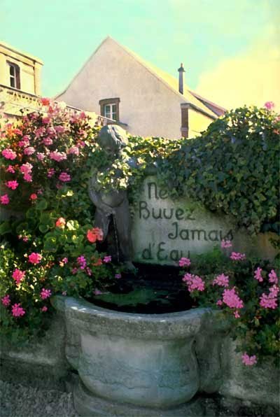 In Brussels, just off the Grand Place, there is a famous fountain with a little boy, well, squirting into the water. It is called "Mannequin Pis." No translation necessary. In the shops nearby you can buy replicas and postcards of this naughty little cherub. They even sell corkscrews with the helix, well, you know where. But my favorite copy is in the gardens of Laurent-Perrier, the great Champagne producer in the middle of the vineyards of Tours-Sur-Marne, just south of Reims, about 75 miles east of Paris. The inscription reads "Ne Buvez Jamais d'Eau" which, loosely translated, means "Never Drink Water." Good advice. Try the Laurent-Perrier Rose Champagne. Yummmmmm.
